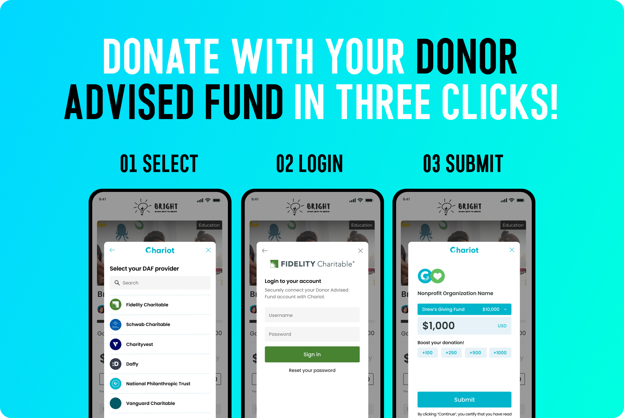 Chariot’s a payment option that nonprofits can add to their website, allowing donors to ‘one-click’ give with their Donor Advised Fund. Chariot enables this by creating a network connecting the $234B in Donor Advised Funds and nonprofits. Nonprofits add our “Pay with Donor Advised Fund” option to their website/payment page. Donors click the button, log in to their DAF account, and make a payment in 3 clicks.